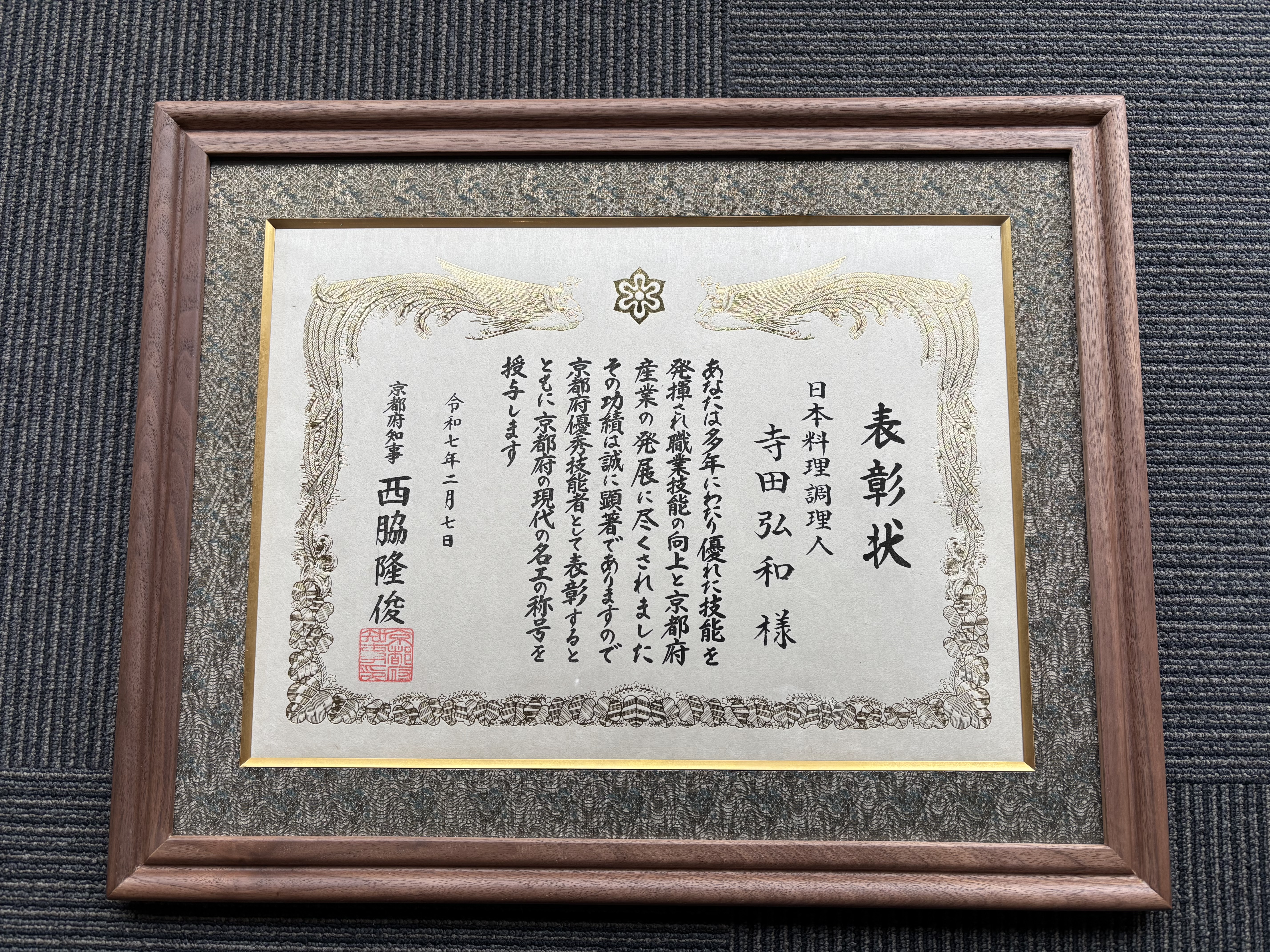 創業80年八光館店主寺田弘和 長年の功績により令和6年度京都府現代の名工に選ばれました
