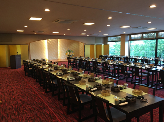 丹波随一の大宴会場で大堰川と京の峰 愛宕山を眺め季節が彩る風景をお楽しみ頂けます。